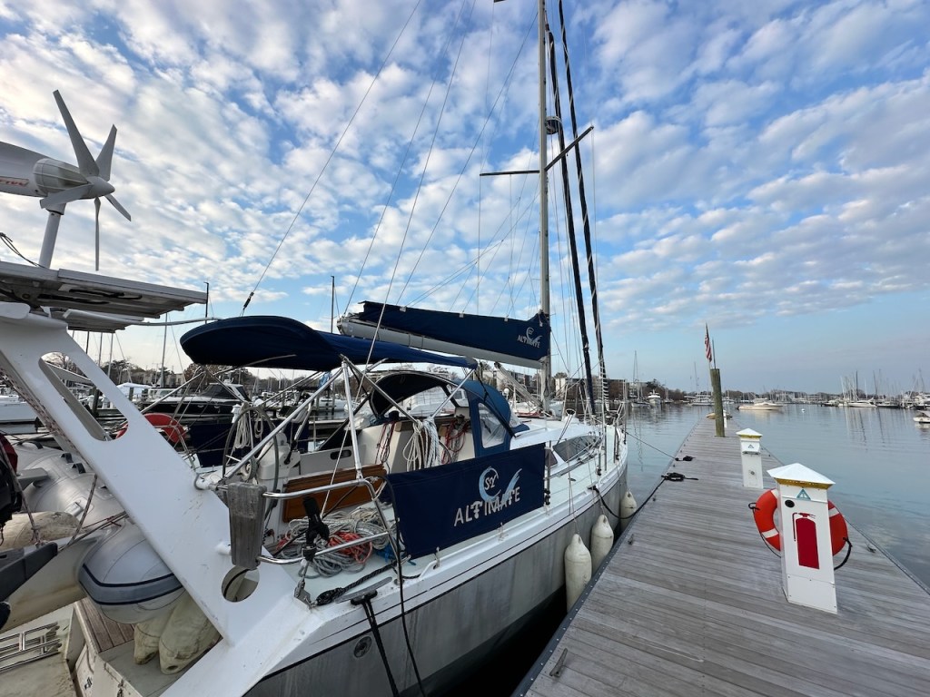 Next Monday was the day. Steve our rigger had called to tell us we could come to get Altimate back to look like a sailing boat. It took them three days to replace and install everything. Steve offered us a sea-trial to check whether everything was working fine. Early Thursday morning the 21 of November 2024 Steve jumped aboard Altimate and we headed into the bay of Annapolis. Steve was a passionate racing sailor next to his professional knowlegde about sailing boats. He moved on deck like he was magically attached to it. It was amazing to see how fearless and easy he was moving to the bow and back with sails up and Altimate healing over. Checking all the new bits and parts as well as the new stay sail. We on the other hand would have crawled on all fours feeling rather uneasy. When he was satisfied with his control check he even showed us how to tag the genoa around the stay sail without furling it. After about 1,5 hours we headed back to let Steve out and then we were finally ready to go south!!! Bye bye Annapolis