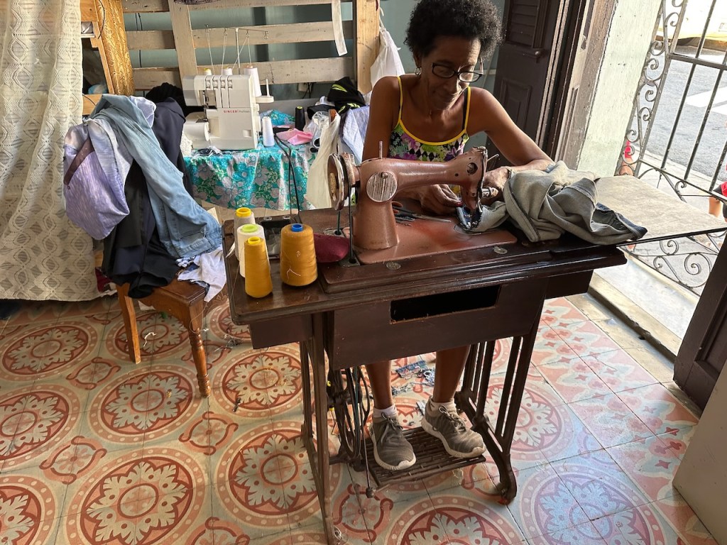 Another day I met up with Anne-Sofie, the Swedish lady who also lives with her husband Göran every year in Cienfuegos in wintertime. They also lived with a Cuban family, Marie-Lou and her husband, but right in the middle of town at “Parque José Martí”. The family used to own a company for lamps including a big building. After the revolution everything was taken off from them. They were left with (I hope I remember correct) half of the house they used to live in. That was the apartment which Anne-Sofie and Gören now shared with the family. Compared to where Gisela and Barbado lived it was bigger and nicer. Well, at least in my opinion. Anyway, we met up for a girly day to go limited Cuban shopping and just have some fun. Sofie introduced me to several small shops which I wouldn’t have recognised as such. Marie-Lou also joined us a bit later. She was very knowledgable in local art and artists. So we didn’t only have a girly fun day, it was – at least for me- as well an educational day. The original reason of our meet up was that I was looking for a sewing lady who could tighten ( yes tighten! not widen 😉) some of my skirts. Ok, I didn’t loose any weight, I just had bought the skirts too big and couldn’t return. But it would have sound good wouldn’t it? Anyway, they knew a young sewing lady, Carmen where I left my skirts to be modified. Knowing that all Cubans need things, I asked her whether she would need some needles for her sewing machine or anything else I might could share. She said she was desperate in need of fixing pins. When picking up my clothes I was happy to be able to bring her indeed a whole package of fixing pins as well as sewing needles. She was so happy that she even didn’t want to be paid. I was happy I could help not needing those pins anyhow but of course I insisted to pay. Telling her that was a present! That only shows again how Cubans have to manage their life and living. Imagine having a business and you are not even able to get the most basic tools? For us unimaginable but for most Cubans normal live.