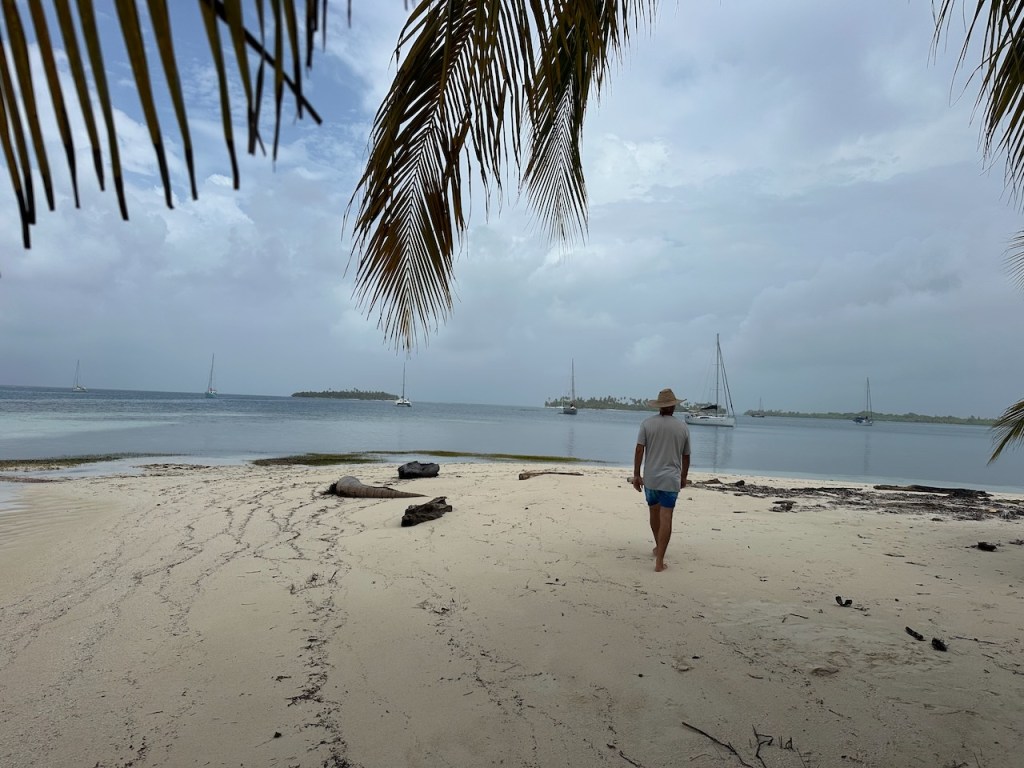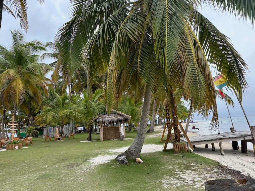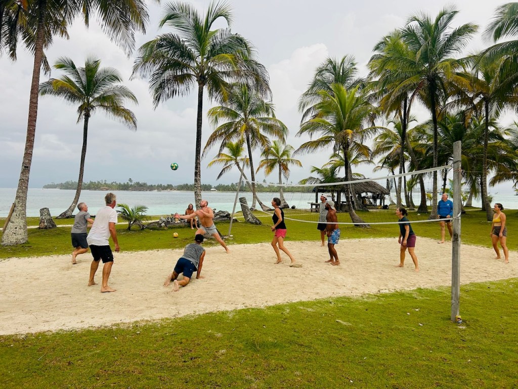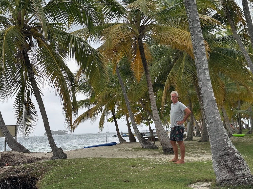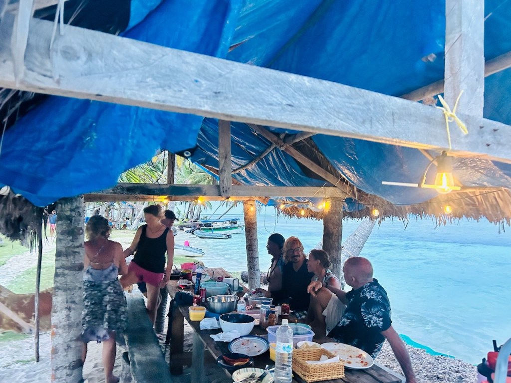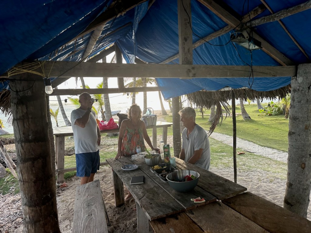 it did look like a log but then it suddenly disappearedthe hut on the left will be the future luxury love bird rent out, the big hut on the right was Ibins new restaurant area – massivehere the view of the restaurant from ashore everything was bigger now – even the signsthe path was not only market by conch but also now with planted palm treesthe south east end of Banedup looked sad, some Gunas had roded too many palm trees that erosion had started the other south side of Banedup looking at Tiadupnow further west of Banedup looking at Quinquindup on the left and Ogopirriadup in the middle, the big island further back is Kalugirdupthe little bar and backpacker area on the south side had improved much, now it looked prettythe places now had star link too as well as enough solar or generators to provide cold beverages and moreAltimate at the north side of Banedup already on our second day Ilka had organised a BBQ on Morrodup because Aydin (her son) had caught a huge fish, big enough to feed a lot of peopleMarc, Debbie and Norbert waiting for the fish to get readymore people had arrived for the feast on our third day we started to play volleyball volleyball and potluck here we had a beer with some friends on the south side of Banedupnurse sharks came close to shore hoping for same easy bitessunset at Ibins and the bar from the south side of Banedup
