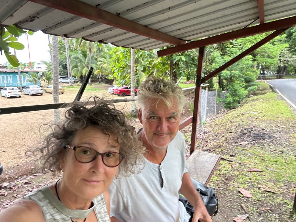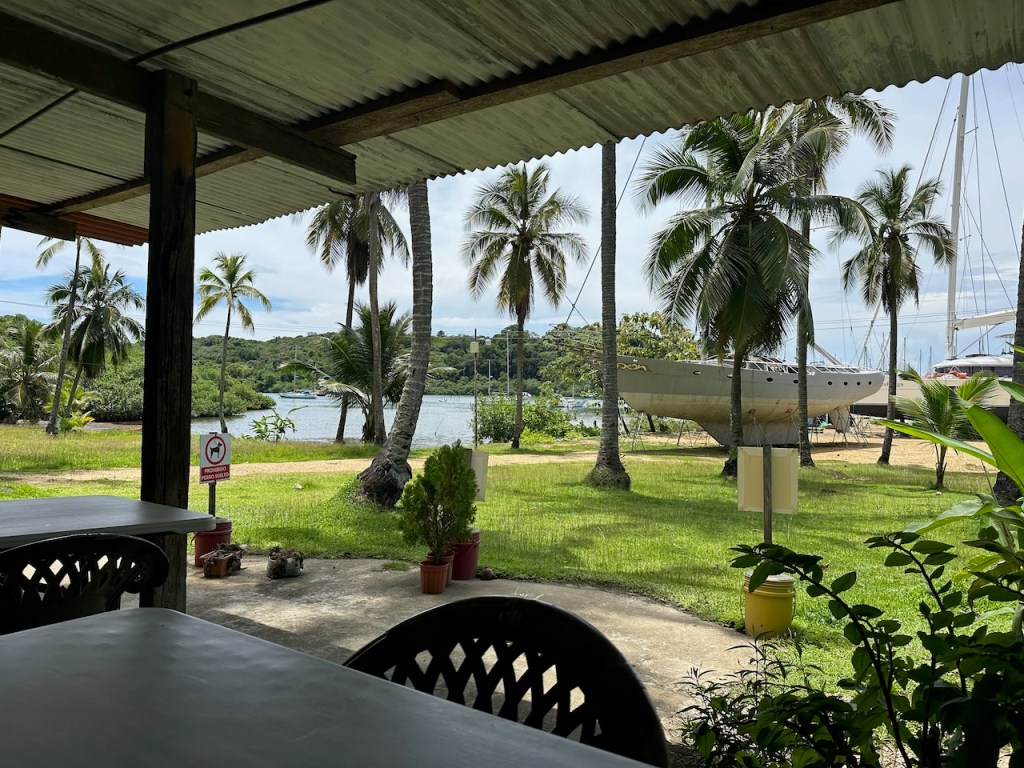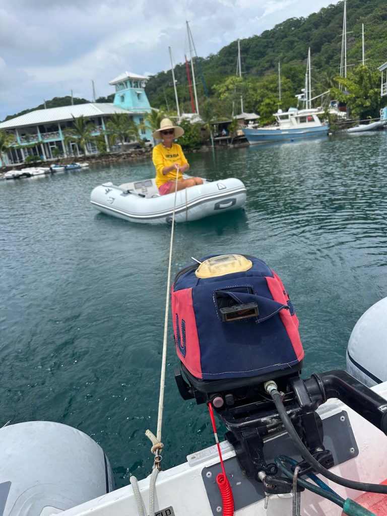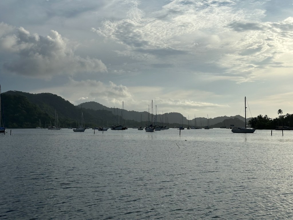 getting closer to Panamáthe space ship like water apartment was now outside of the bay; we were glad to arrive before sunset as this apartment was neither lit at night nor mentioned anywhere the marina at night, the chandler underneath the bar made it look so much nicer; before it was just a shabby open concrete areaovercasted anchorage didn’t look so niceNorbert was pulling me in our new dinghy to Altimate new dinghy on the left, old one on the rightlunch at Nancy’s place with the nice view on the anchoragethe anchorage view from AltimateI do look like I just got up but that was my professionally styled just out of bed look!!!! waiting early in the morning to get the bus to Sabanitas for grocery shoppingthat area always looks so lush, green and freshenjoying the bus ride