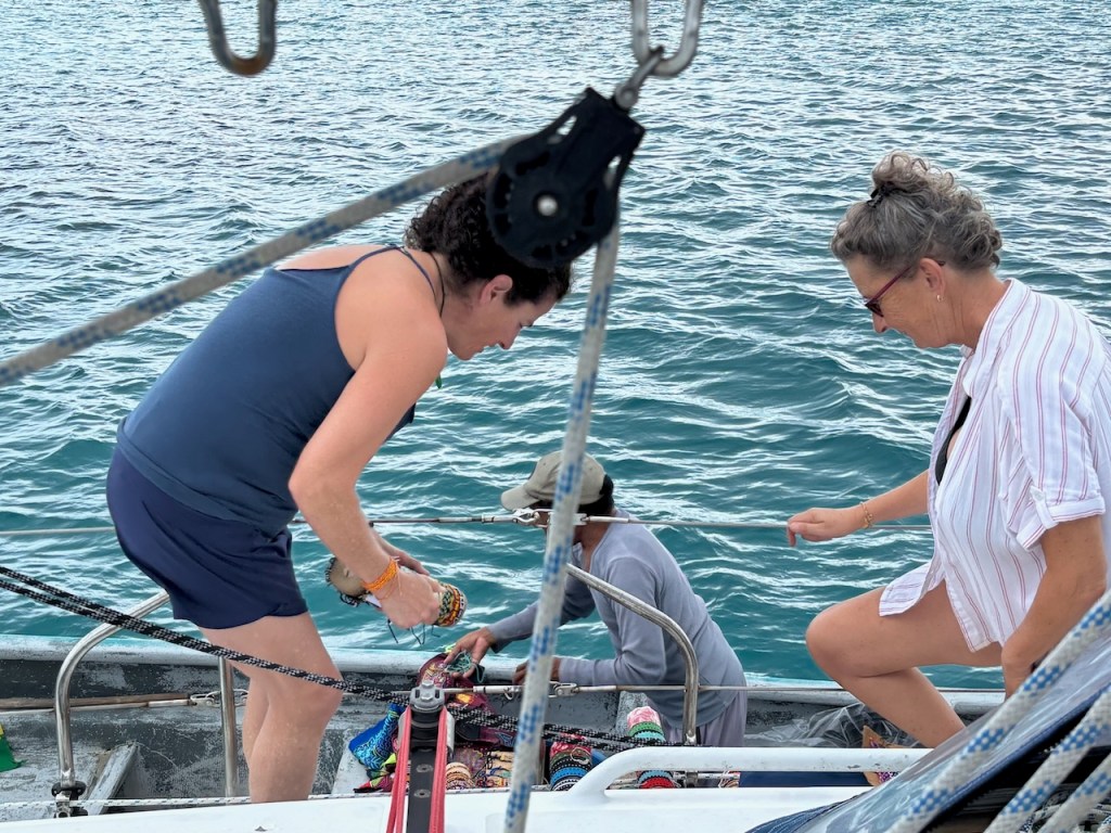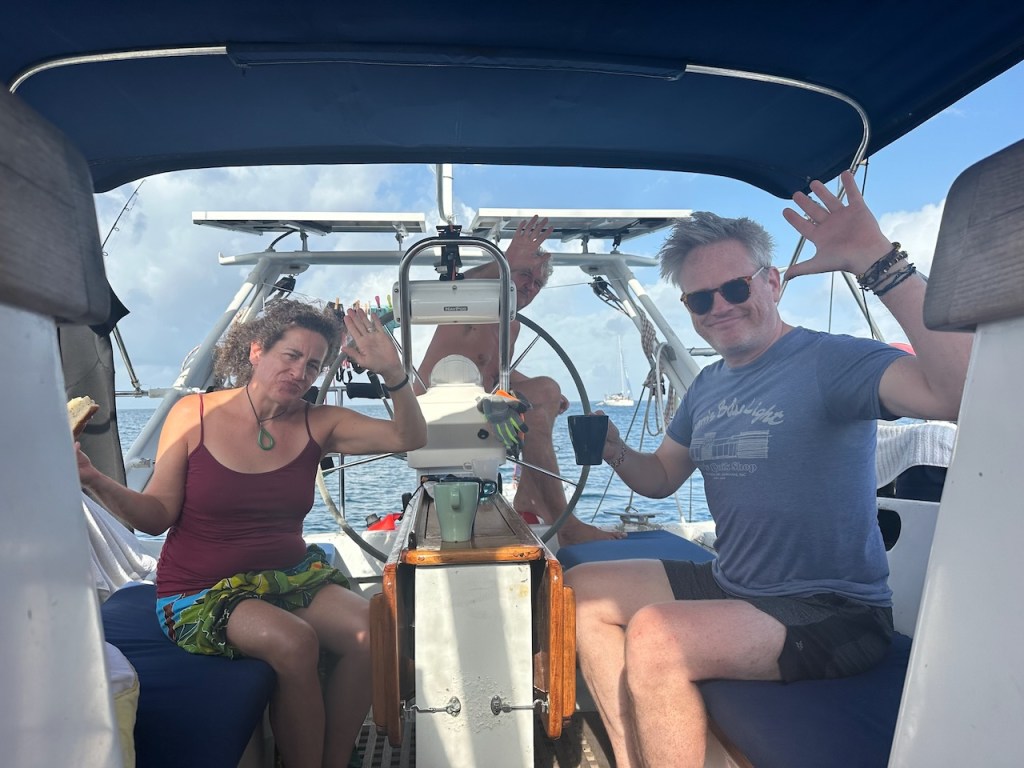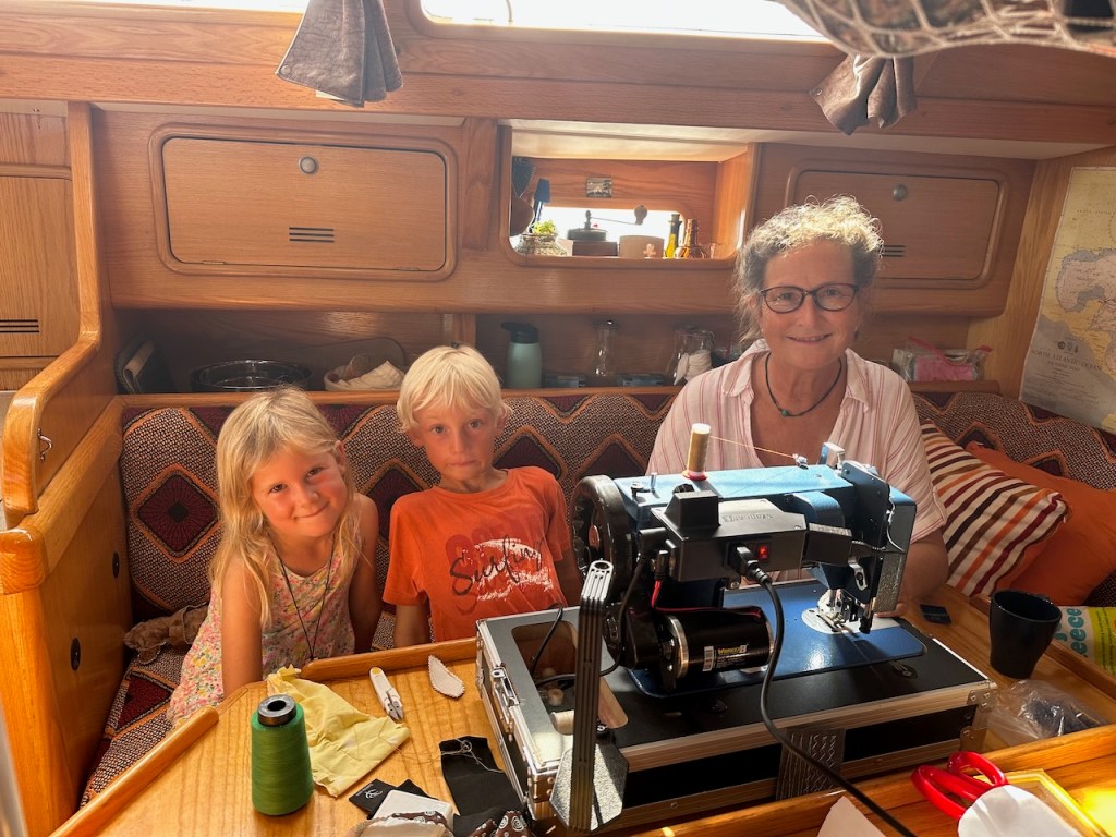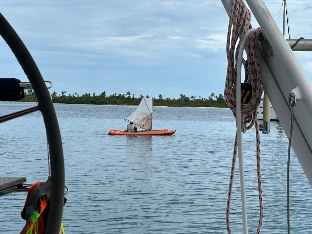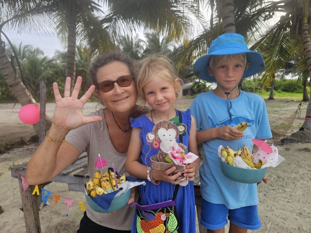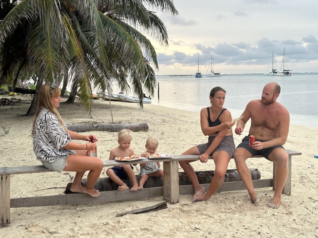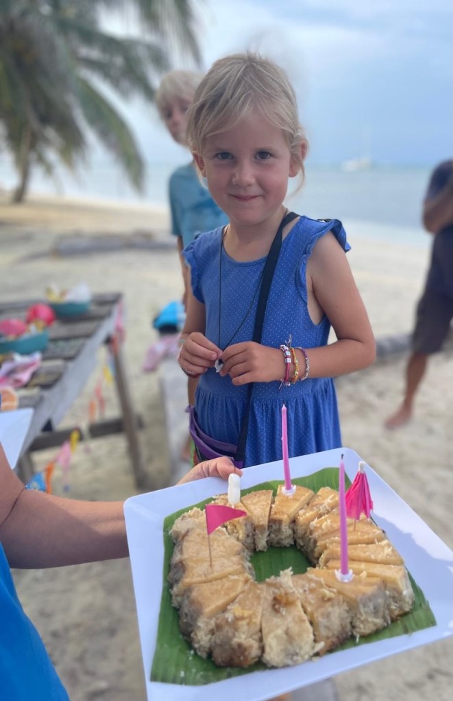 another last day – half of the French crowd left the next daybirthday presents for little Julia who turned 5 -I made her a little monkey and Banana pirate and banana dolphinsand of course pizza for the birthday kid and friendsIbin made a coco cake water tableand that reminds of good old cowboy days leaving their horses in front of of a saloon – nowadays we leave our dinghies Lukasc a little exhausted after volleybeerthis poor fellow jumped on our stern – he was already dead when we found itsewing day on Altimate – Janis was very much into sewing he wanted to make a little fishfish and little monkey united