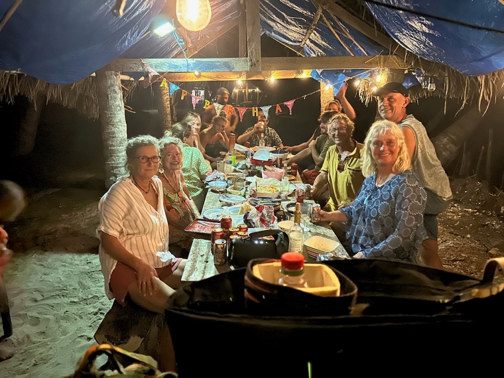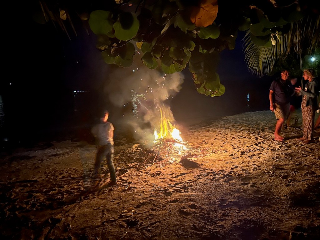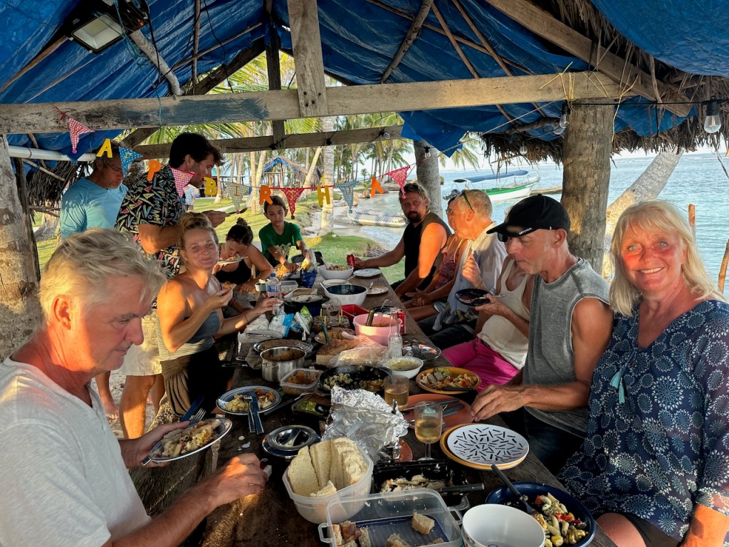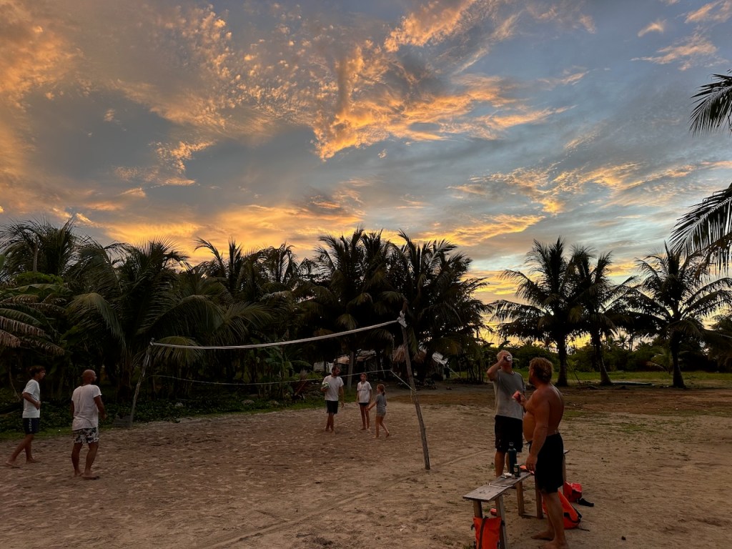 the pretty bar on the south side of Banedupa Kuna with sailing byKarin, Eric, the Dutch couple we had met again, Norbert and on the right Monikids feeding at the beach with pizza from IbinI just like the colourful still lifeIbin’s bar at nightmy beginnings of the making of chapshere some fitting at the beach Debbie had invited the Dutchies, Mark and us for dinnerthat was Karin’s birthday party on BBQ island, we had a big potlucka birthday jump, Eric, Lotti, Oskar, Karin, Till and El capitano Doghan on the left and a another sailor, just can’t remember his namebirthday potluckalmost done with the chapsthe volleyball net was broken , so I took it and sewed back together, Norbert had to hold itthe net reinstalled – ready for usea bon fire on the south side of Banedup – a last evening for a few boats fairy tail pics from the night taken by Oskarit doesn’t look real , does it? but it was !!!a typical rainy season skya dinner at Ibins with DebbieAyla, Ilka and me teaching the kids (and parents) how to play, on the left Ayla, Aydin and Doghan, Carmen, Camille and May on the other sideonly a few players left just another pretty sunseta walk at the beachsometimes we could even see the mainlandI found a blooming flower on Banedup !!! I have no idea what kind of flower that isEl Capitano was fishing one day with Aydin and Doghan – they brought a few of these crabs, they tasted very nice