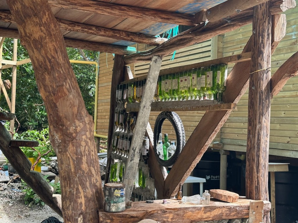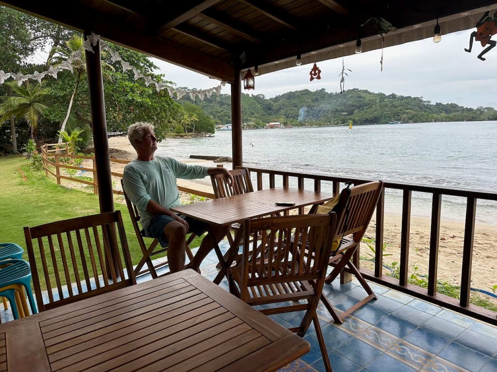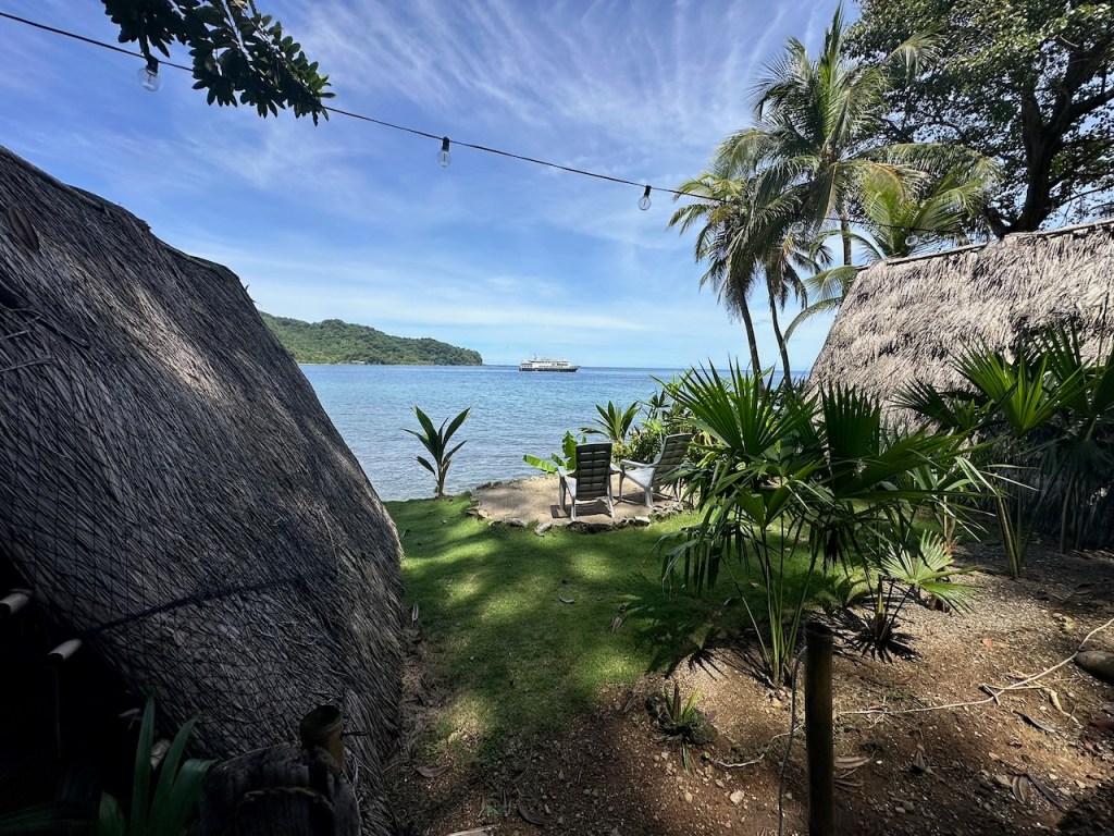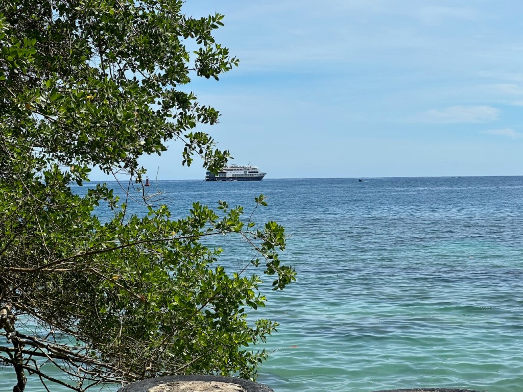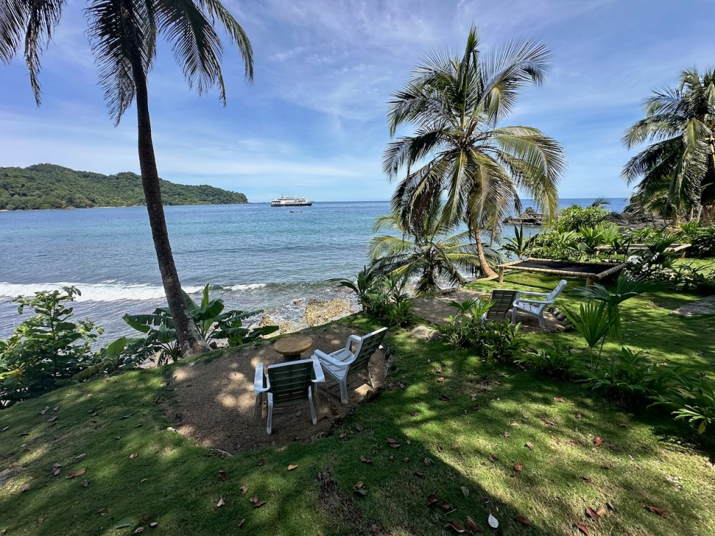 Sapzurro always pretty even when overcastedI liked that they were able to give old bottles a new purposeAltimate almost alone , the two other boats belonged to locals and were hardly used- nice was the fact that the wrecks had disappeared since we left last timethe lovely bay of Sapzurrowhat was El Capitano looking at?we noticed some new accommodations, some still under construction but also using old bottlesthe piece in the water was a remaining of the boat which had just sunk when we had arrived the first timewe even saw some ducks, I could not recall seeing them beforethe view from Lina’s place – we had dinner there one dayone day this cruising ship anchored at Sapzurro – we were strolling to the south east end of the bayat the furthest point they had built a cute resort with triangle roof hutsI peeped inside of a bathroom hut- it looks bigger in the pic than it actually was the sleeping huta terraceand the beach and eating area – I guessI saw a monkey – but can’t find him anymorethe weather was not that pretty but Sapzurro still looked magical- in a different way though