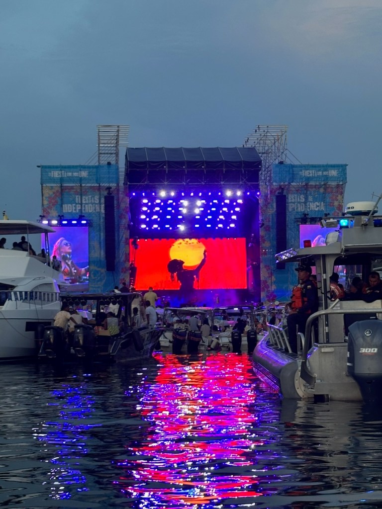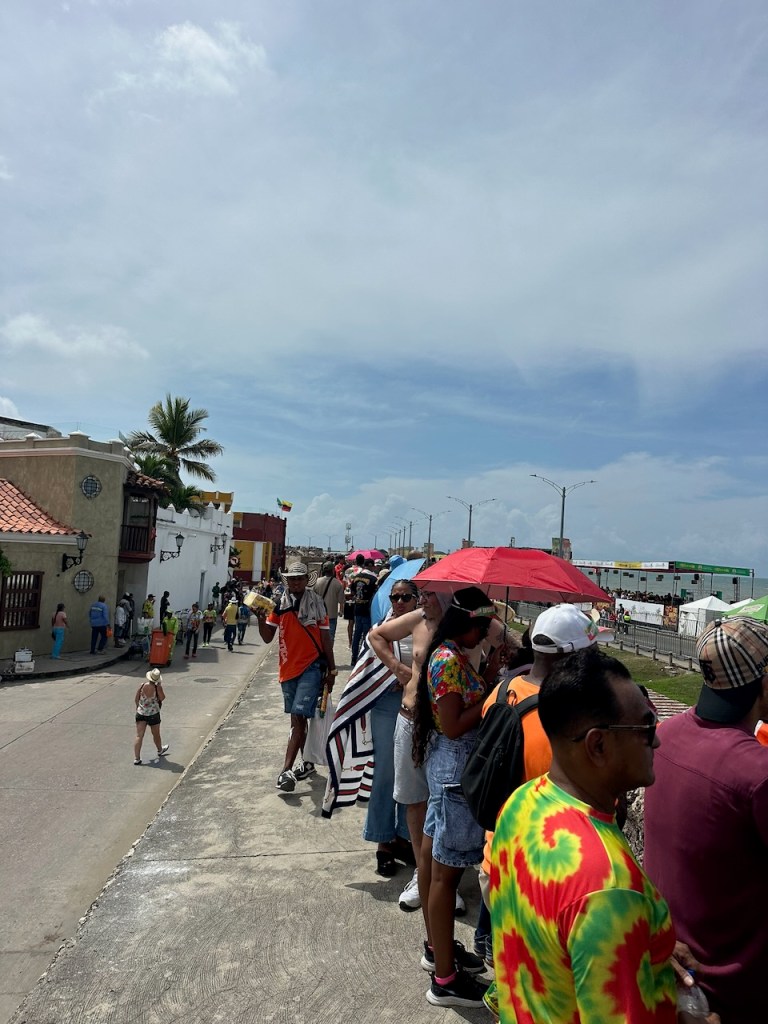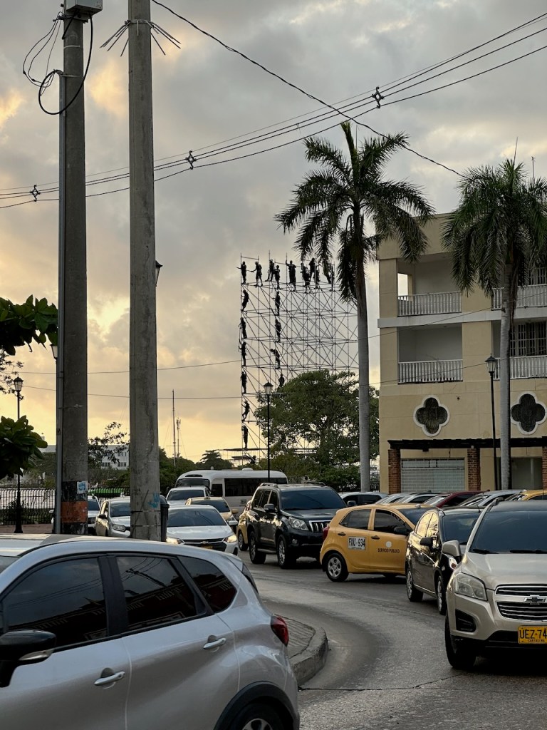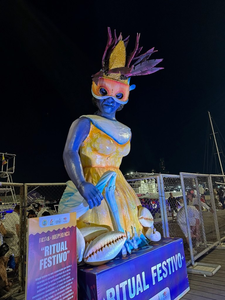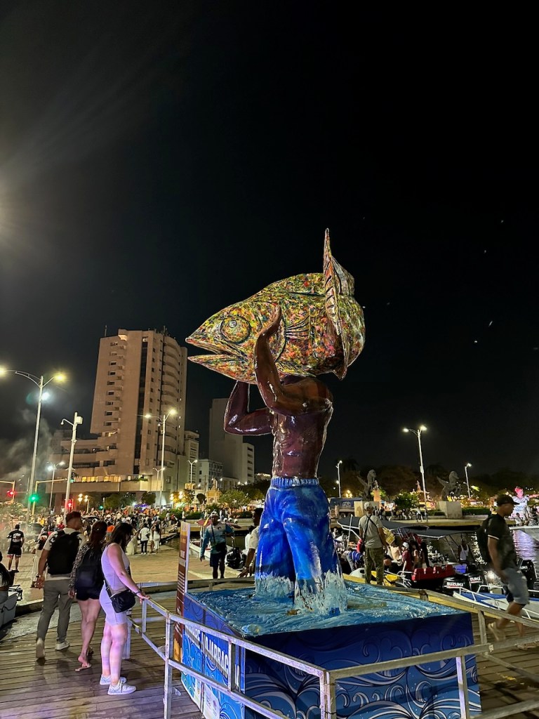 only one foto from the entrance/exit of Cholon; since last time they have set many many buoys, it gets crowded on weekends, early in the morning it was very peacefulthe east tip of Boca Grande Cartagenathat was not a mural!!! the people were building up the stage for the big independence music event right at the bayhere a close up from the brave constructors – not at all a job for mepre parties were already happening; this was a shake the boody competitionla plaza Camellón de los Mártiresparty area around Torre del Relojmore party behind the wall close to the clock towersome figures alongside the muelle, I think they represented the different cultures and areas of Colombia