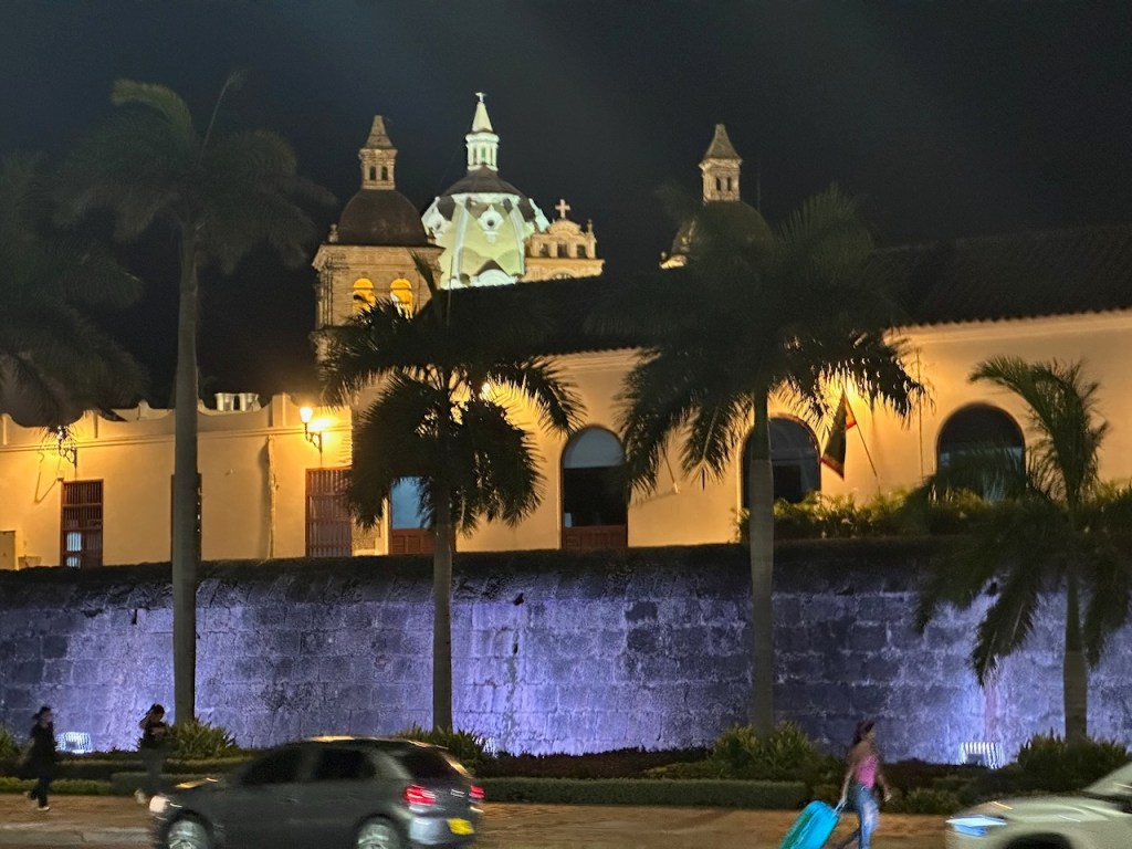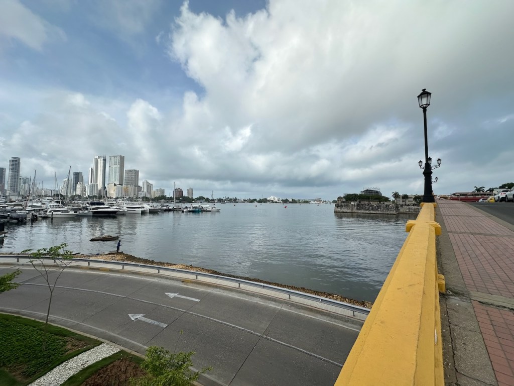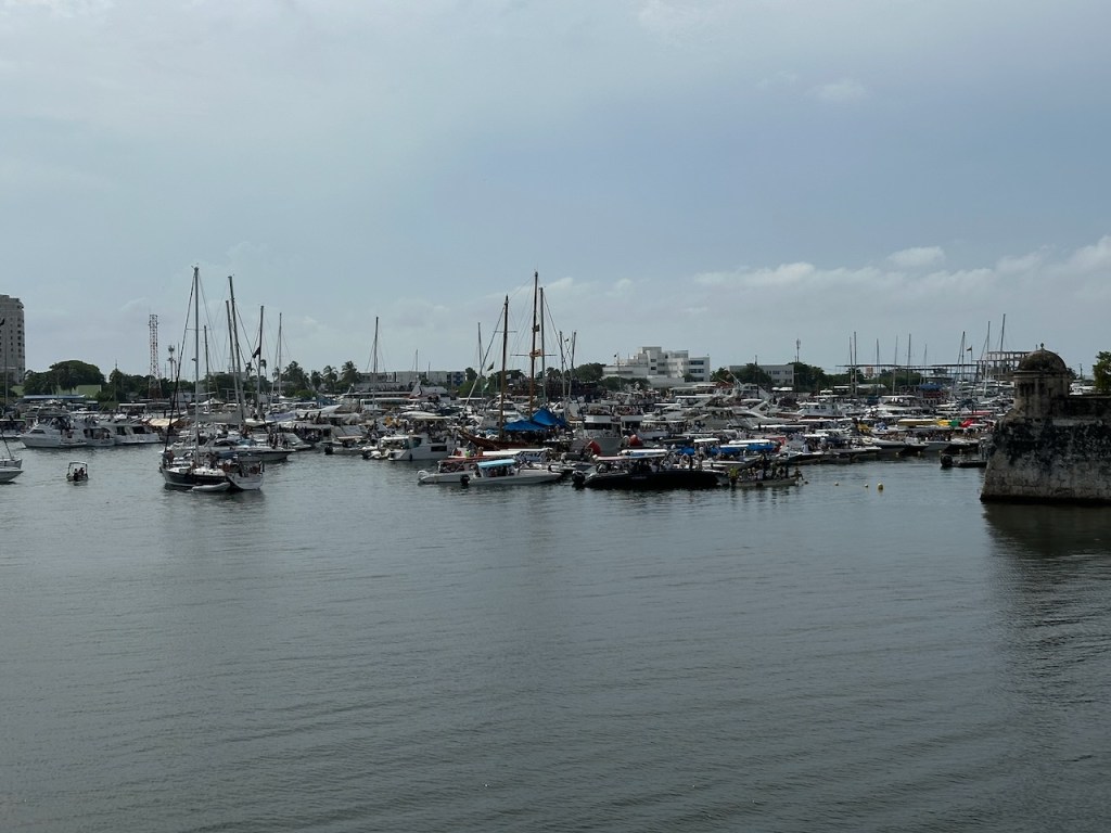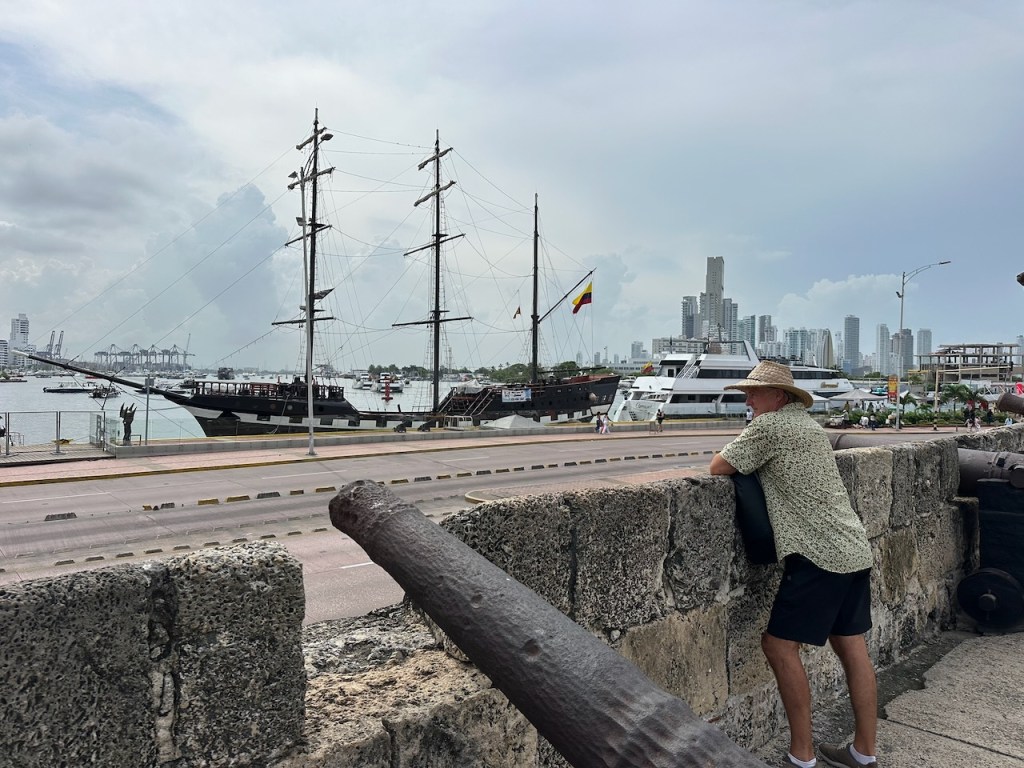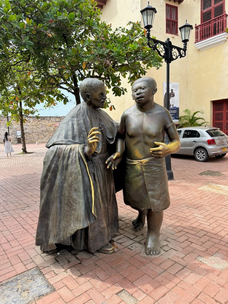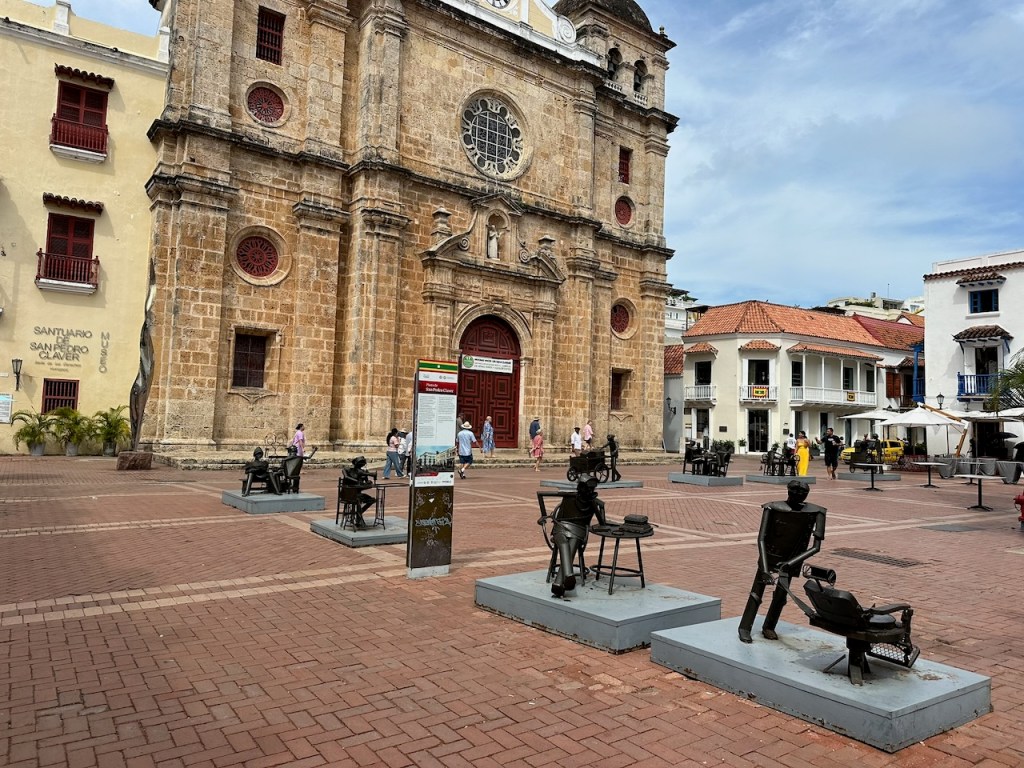 the cool district of Getsemanilooking to the bay from the wallThe Square San Pedro Claver includes the church of the same name. What stands out in this location is the statue crafted by artist Enrique Grau, portraying San Pedro Claver the Jesuit missionary known as the ‘slave of the slaves’, which contrasts with the avant-garde pieces created from scrap metal by Edgardo: (the words from the sign)San Pedro Claver the Jesuit missionary El Capitano ain’t he cute? sitting all alone on that big benchone of the pretty streets in the old citythe stage ready to let the music outI always wanted a x-mas coffeethat was how the bay usually looked likefor the music event it looked like that absolutely packed boats everywheresome boats were bigger some smaller but on all of them partyyyyyybooty dance and selfie timethe stage