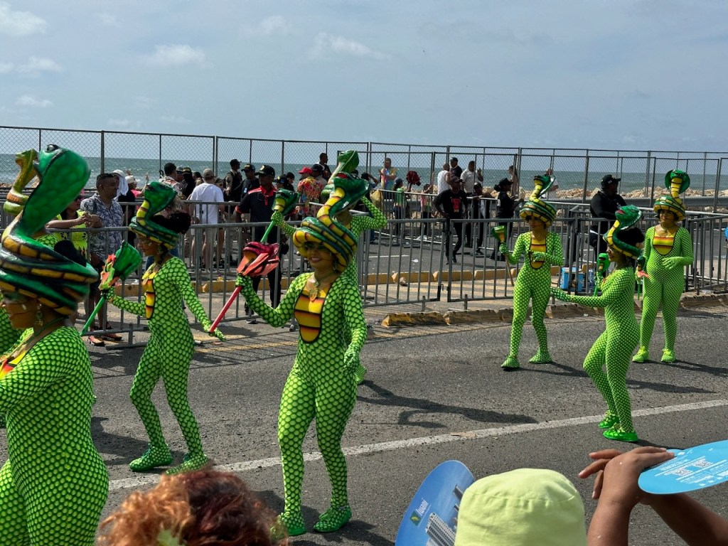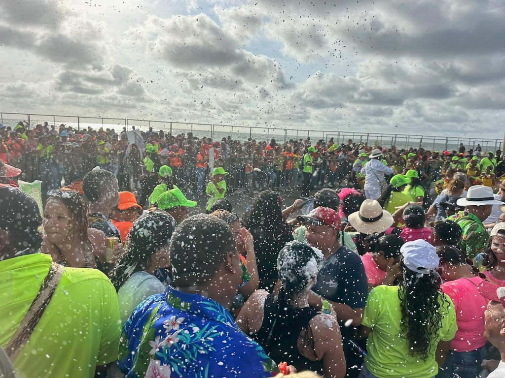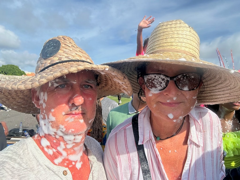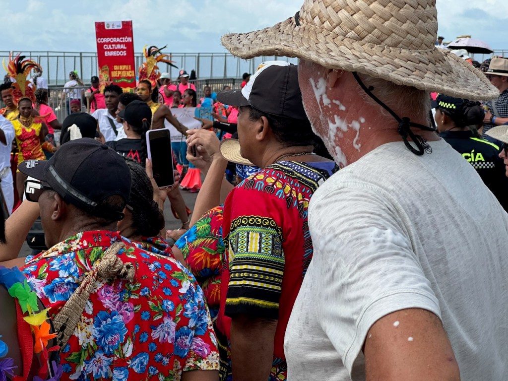 it was slowly getting crowded – here some vip seats – well at least one needed to get some tickets the cheap areas along side the wallhere we were on top of the wall waiting – it was sooooo hotnext to “espuma” (foam) and beverages some guys also sold fried plantains more and more people were approaching to see the paradeas it was so hot on top of the wall we had moved a bit and had finally found a great place we were right next to the street were the parade passed bysometimes the costumes were really funnyNorbert had his first espuma attackhere we had some fire guys or whatever they representedthe funny ladies who taught me to espumasome marines were always on the carts with the beauty queens – they were always stone faced – not in party mood it seemedshe was the Bolivar queen, the state of Cartagena aqua man – he was big!and the espuma couple espuma snow