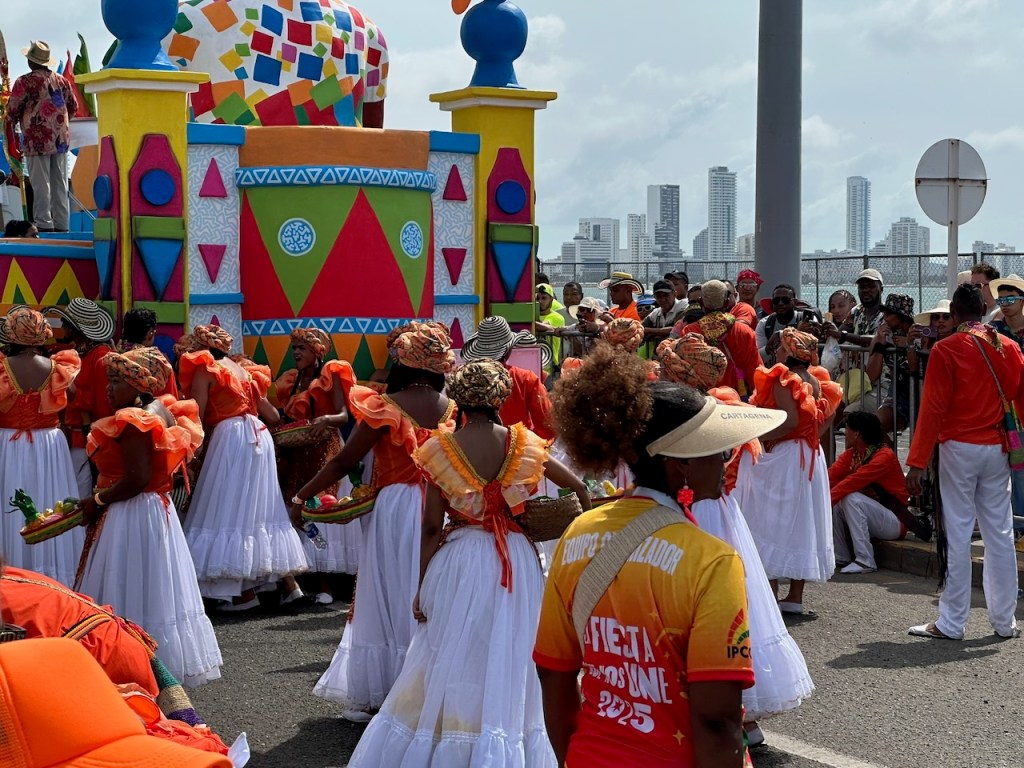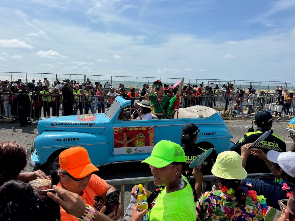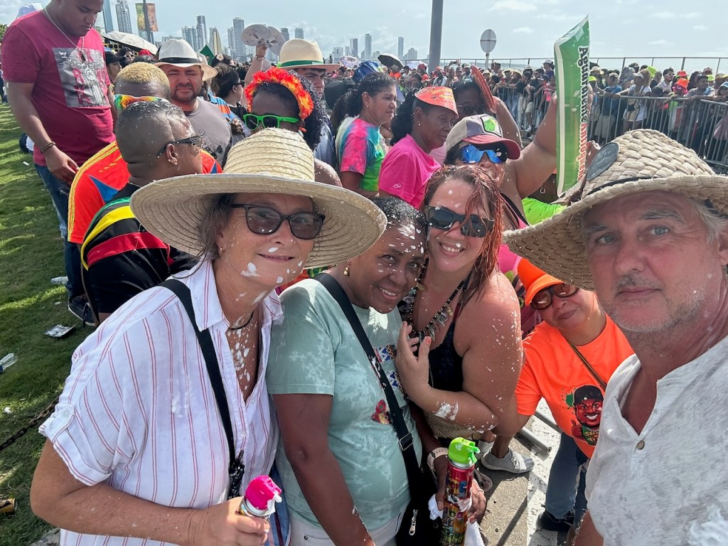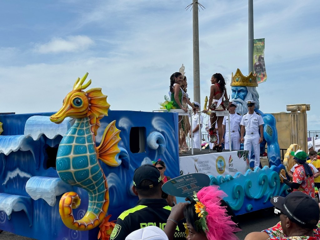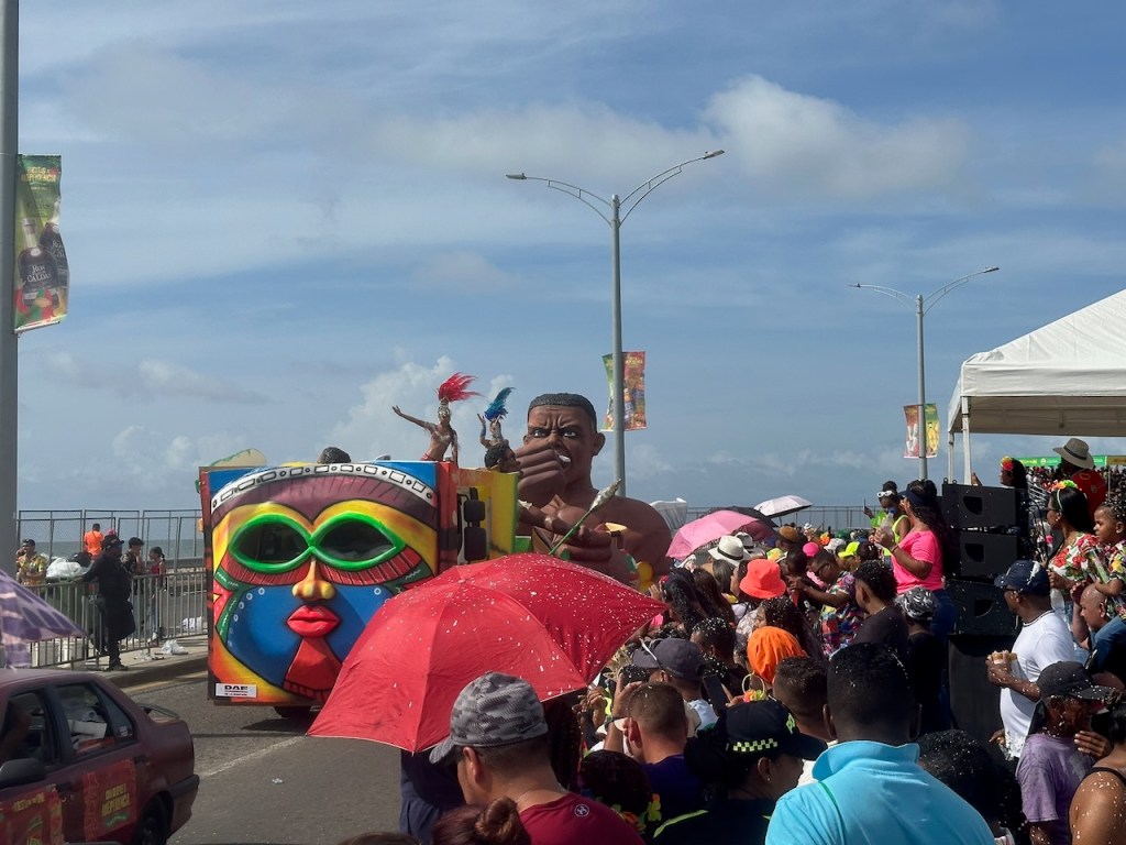 it was slowly getting crowded – here some vip seats – well at least one needed to get some tickets the cheap areas along side the wallhere we were on top of the wall waiting – it was sooooo hotnext to “espuma” (foam) and beverages some guys also sold fried plantains more and more people were approaching to see the paradeas it was so hot on top of the wall we had moved a bit and had finally found a great place we were right next to the street were the parade passed bysometimes the costumes were really funnyNorbert had his first espuma attackhere we had some fire guys or whatever they representedthe funny ladies who taught me to espumasome marines were always on the carts with the beauty queens – they were always stone faced – not in party mood it seemedshe was the Bolivar queen, the state of Cartagena aqua man – he was big!and the espuma couple espuma snow