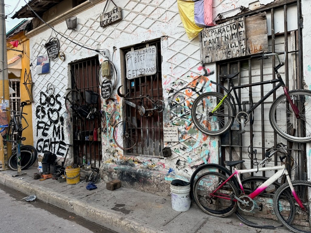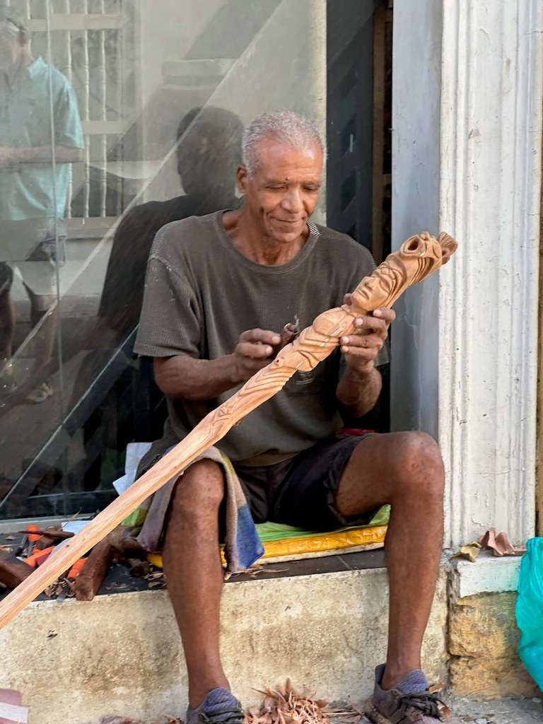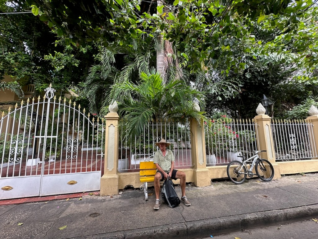 one evening at the restaurant of the marina where we used the dingy dock that was a pretty café in GetsemaiReina in blue and her sewing girls, Reina made me a bikini the always sportive Colombians; every night they were kids or adults playing all sorts of sportscycle repairPaul and Suzette at Plaza de la Trinidad in Getsemaniwe were strolling around the old city and this guy did beautiful carve work – though I didn’t understand what that stick was supposed to bethe garden of the Universidad De CartagenaNorberto, Suzette and Paul from Altairethis guy was very either brave or just liked to be photographed; he was sitting low right next to the pedestrian pathand here we had a cocktail with a burning mouse