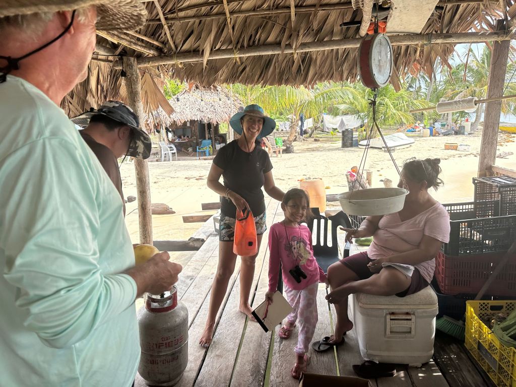 We spent 4 days at Green island cleaning up and getting Altimate back to a two pax boat. Ciganka was getting new guests and we headed to the pool. Saying hello to Debbie and co, playing a little volleybeer and enjoying a birthday potluck at Bbq island. A couple of days before we had ordered some groceries from supermarkets in Panama City, which were picked up by Elio. One of the veggie selling boats Kuna. The strong wind and resulting waves made it difficult for the lanchas to bring the groceries to the pool. So we decided to sail to Elios island Esnasdup. Meanwhile he had built a small dock for dinghies and a hut for his veggies. Us being curious anyway to see his new “shop” we left the pool after 4 days and sailed to Esnasdup. The shop turned out nicely and made it easy for sailers to come by to buy veggies, fruits, beverages. Even diesel and gasoline was now available. While waiting for our delivery from the supermarkets we did some projects. I started to pattern new bedsheets and Norbert was – can’t remember- doing something else. When not busy we caught up with old friends who turned up at the anchorage. Gloria and Mike from Respite as well as Mark and Helena from Cloud Nine, which we had met 3 years ago at Banedup.